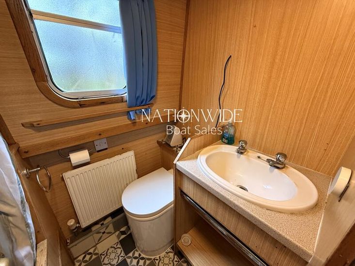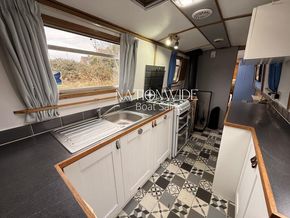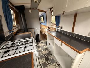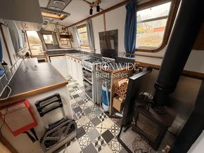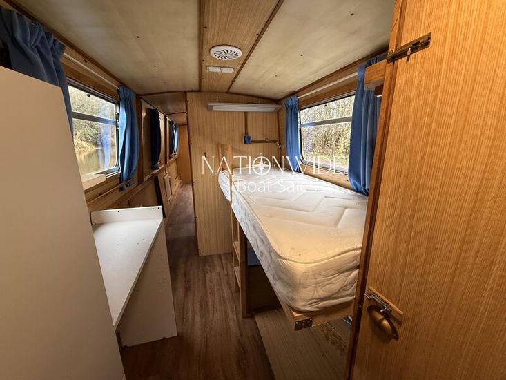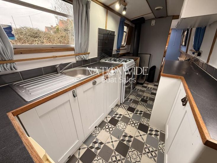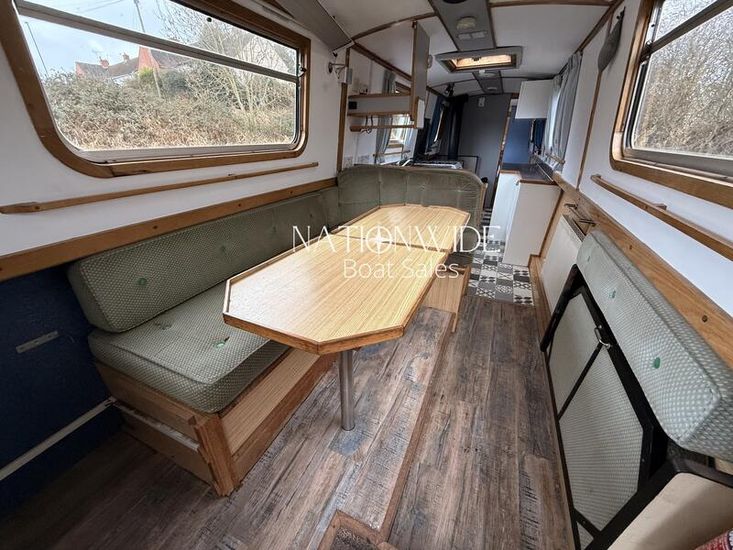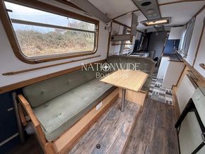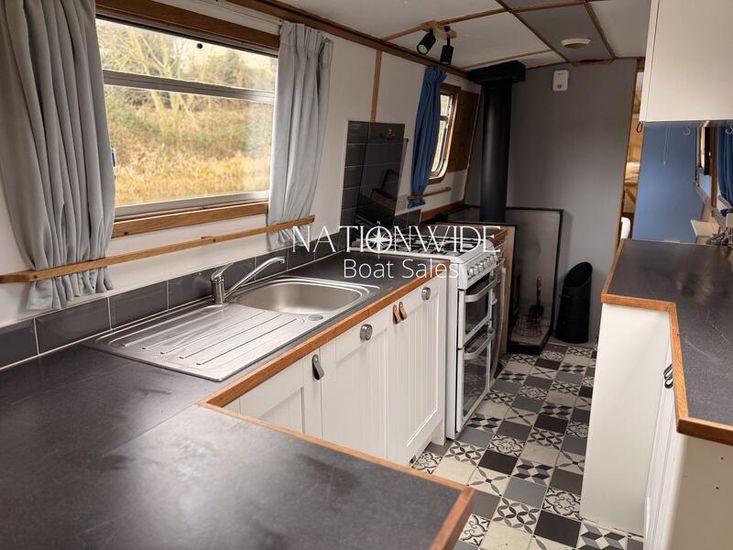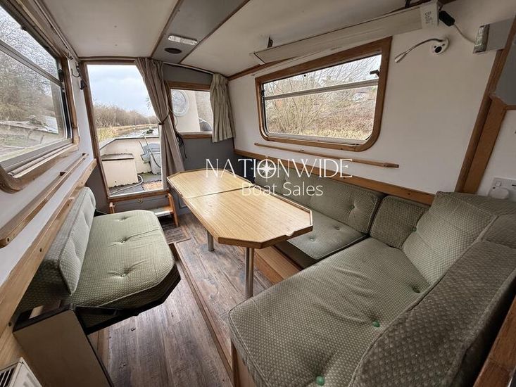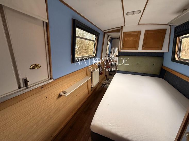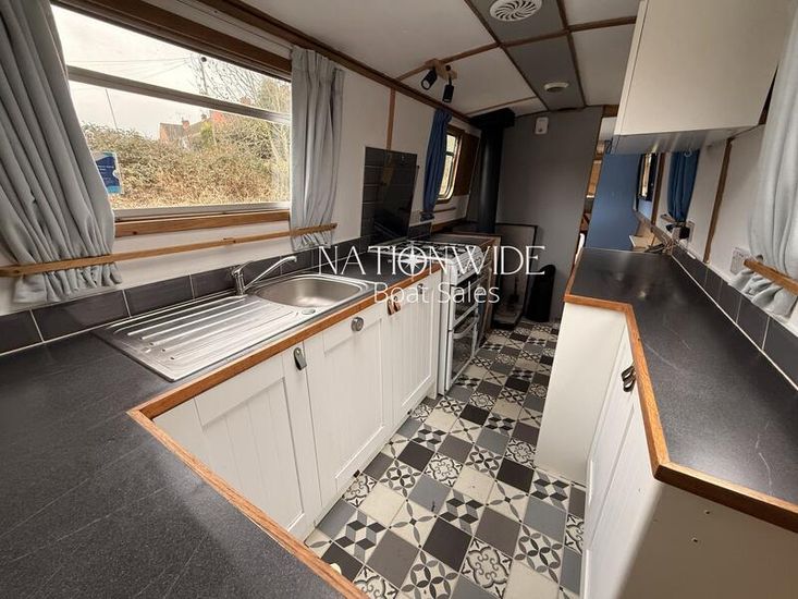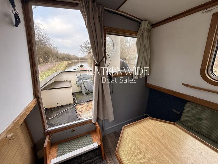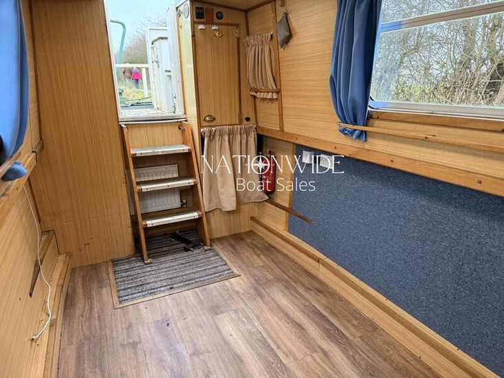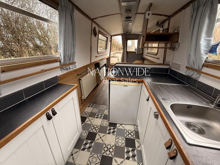Constructed in steel with a flat bottom hull and top-opening windows, she offers scope for cosmetic updating while already providing the essentials for comfortable life afloat. She was last blacked in 2020 and holds a Boat Safety Certificate valid until 2029. A side hatch adds extra light and access to the cabin.