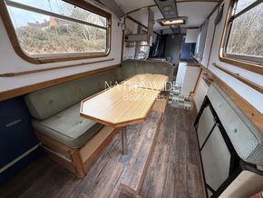 The accommodation provides up to five berths, including a fixed double bed and single bunk, with an L-shaped dinette that converts into a further double berth to the bow. The galley is fitted with a Hotpoint cooker, Inlander fridge and laminate worktops, while laminate and vinyl flooring run throughout. The bathroom includes a compost toilet, vanity basin and hip bath with shower over, offering practical facilities for extended stays aboard.