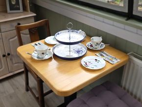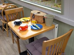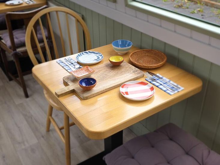 Fully equipped with 6 tables, 12 chairs and a dresser for storage. A full
