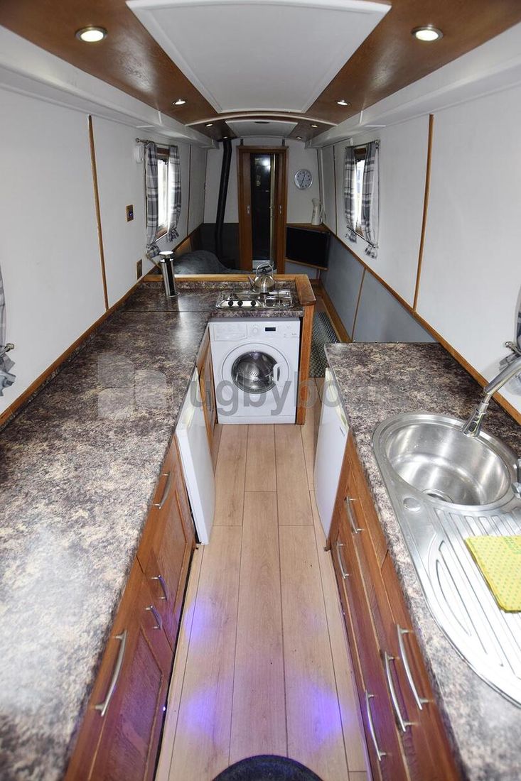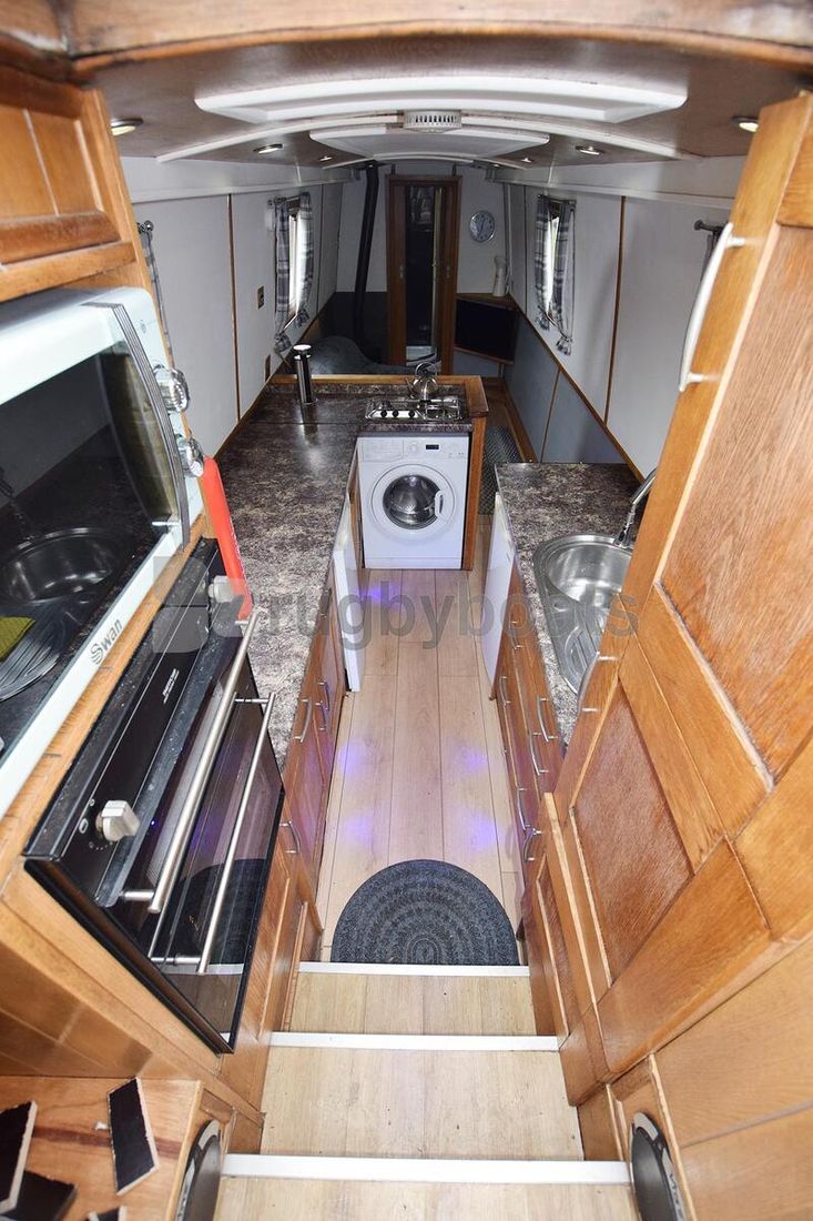 Steps lead down into the galley. This is over 11’ long and utilities comprise of a stainless steel sink with drainer, a 12v fridge, a separate 12v freezer, a 3 burner gas hob, oven & grill, a microwave and a washing machine. There is also plenty of storage. The electrics cupboards are either side of the steps and there is a Sony radio / CD machine.