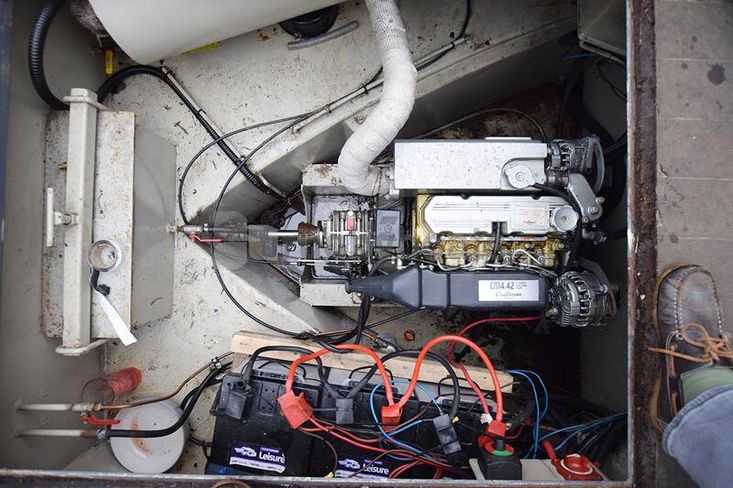 The stern deck is well proprtioned at 7’ long and is a good social space whilst cruising. The engine, a Craftsman Marine 42hp with hospital silencer, sits under the deck boards. This was last serviced in October 2025. The two gas lockers are on the stern deck which also serve as seats.