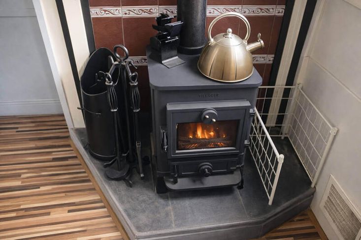Saloon: A bright and comfortable living area with multiple windows for excellent natural light and ventilation, and a solid-fuel stove on a raised tiled plinth providing warmth and charm.