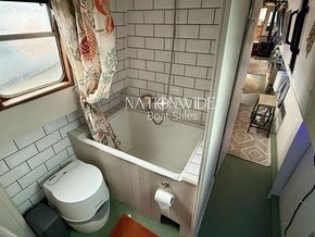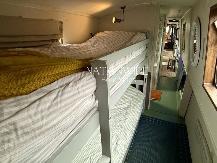 Inside, the boat features a cosy and inviting interior with two berths in total. Freestanding bunk beds provide flexible sleeping arrangements and can easily be replaced with a double bed if preferred. The walkthrough bathroom is fitted with a cassette toilet, vanity basin and shower over bath, providing all the essentials for life afloat. The galley is equipped with a cooker and a 12v fridge/freezer, offering convenient onboard catering facilities. Flooring is finished in lino, with refreshed painted tongue and groove cabin sides creating a classic narrowboat feel throughout.