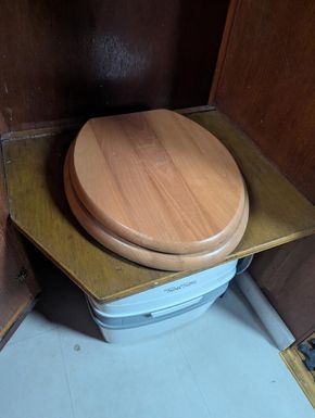 Cassette toilet with wooden toilet seat