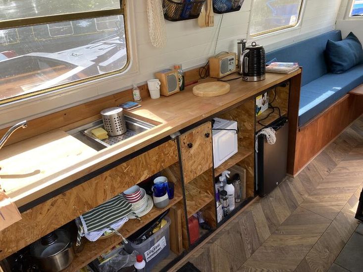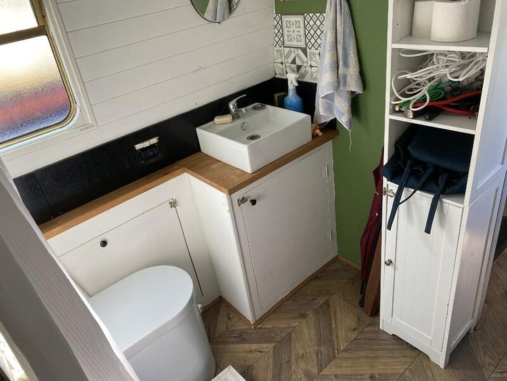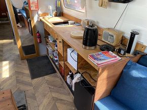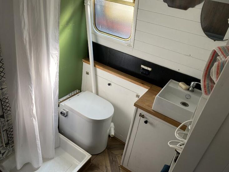 The shower room is next which has a composting toilet, shower and wash basin the galley has an Absorption small fridge top loading washing machine.