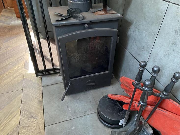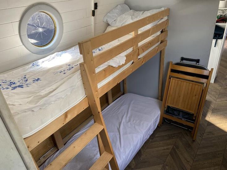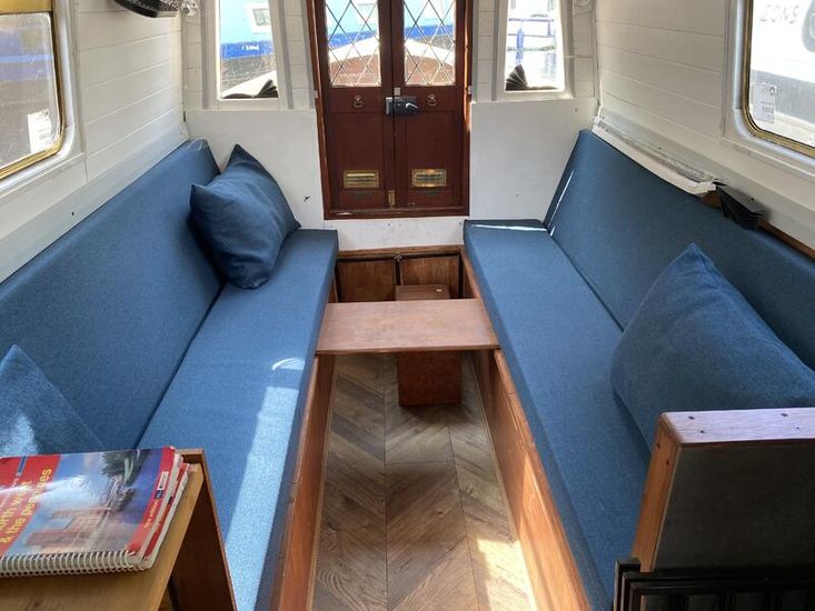 The solid fuel stove is just in from to the forward bunks which convert to make the double bed.