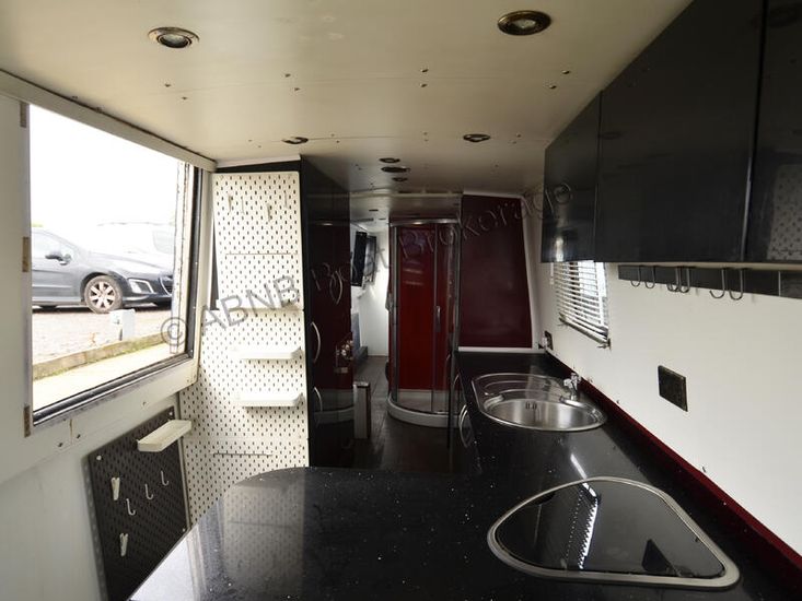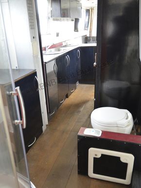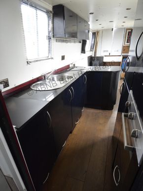 The adjacent galley is well fitted with upgraded finishes including quartz worktops, engineered oak flooring, generous storage, gas cooking and a 12V fridge/freezer.