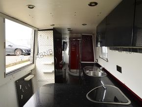 The walk-through shower room houses a cassette toilet and the washing machine is neatly stored away in a cupboard. Hot water is heated by the gas boiler.