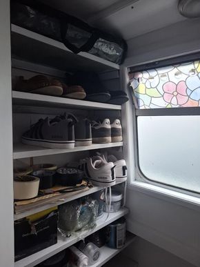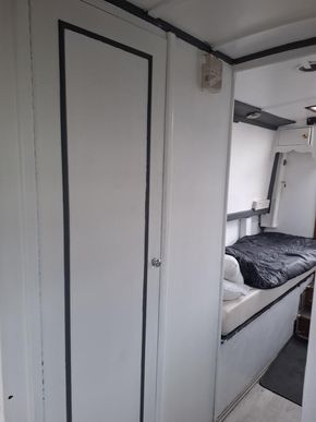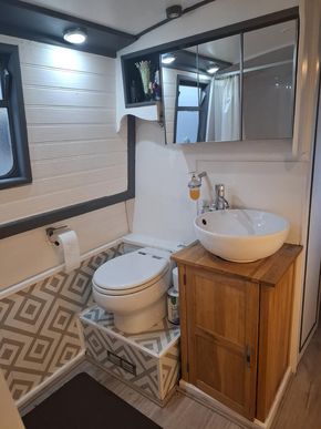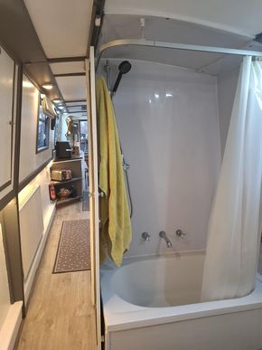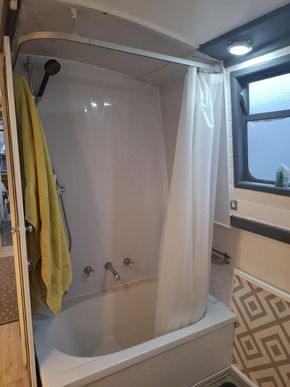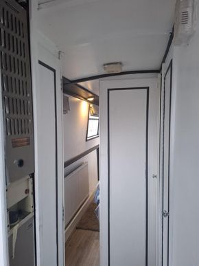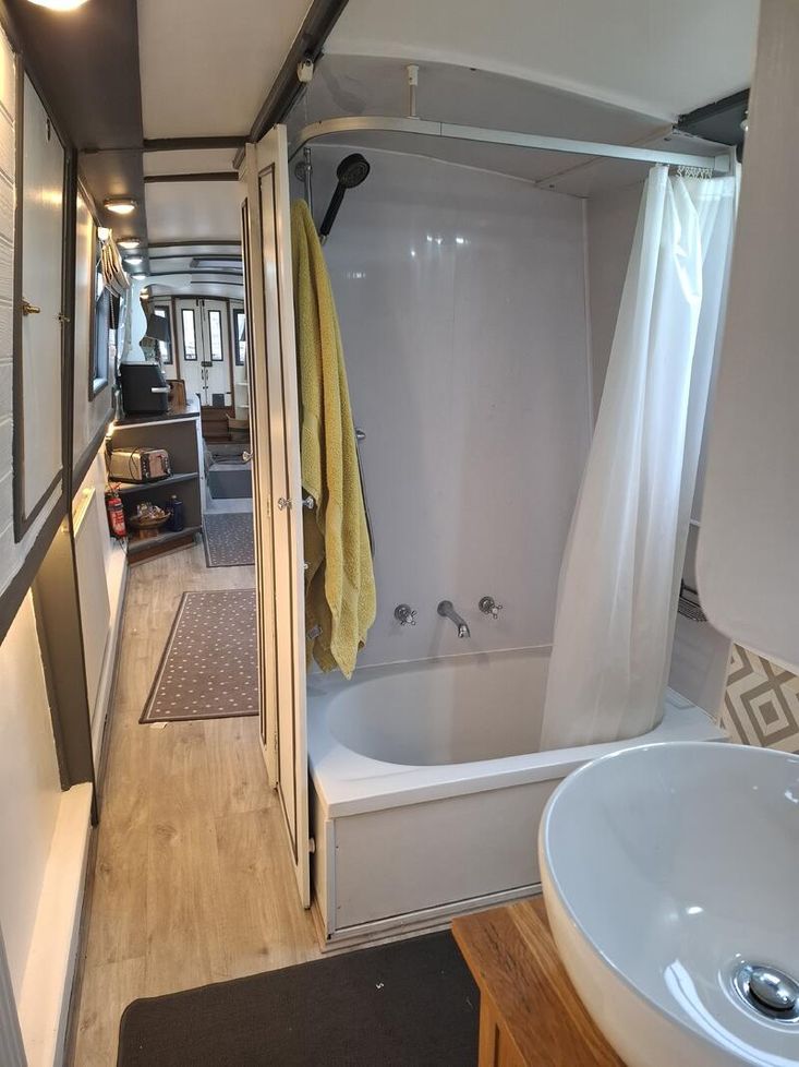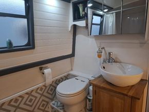 Bathroom Description: Shower with hip bath, pump out toilet, sink and vanity unit with overhead cupboard with mirror. Duck hatch along hallway.