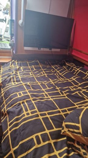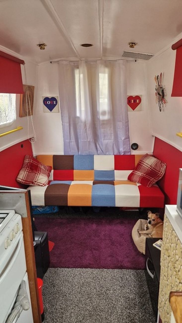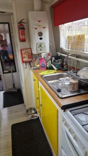 * Kitchen/living area - Morco instant hot water heater, large sink and draining board, oven/grill, hobs, 240v fridge/freezer and small double sofa bed.