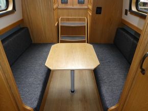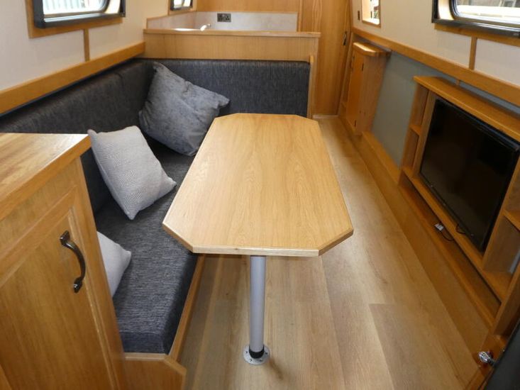 Entering from the bow you step down into the saloon area. There are wardrobes either side of the bow doors, and a further single cupboard with shelves. An L shape dinette provides a dining area as well as a make up double berth.