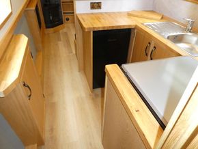 The galley is in a U shape with side doors opposite.