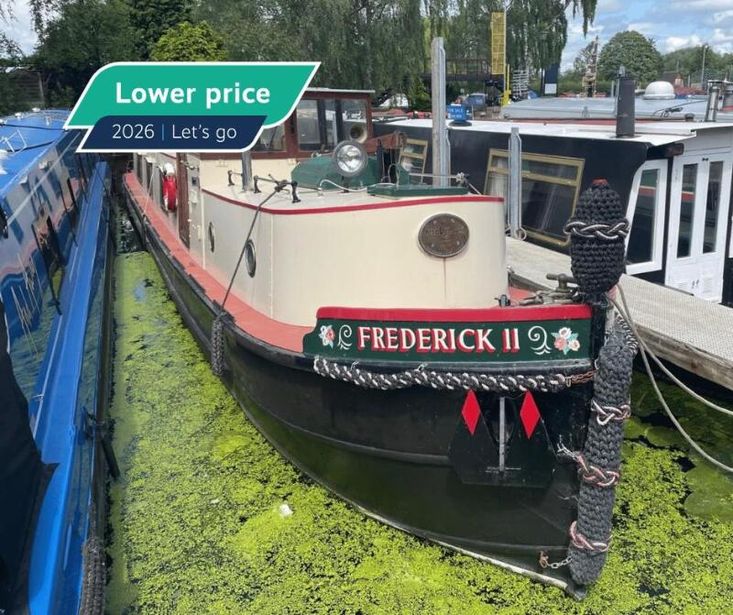 Fredrick II is a unique boat that is full of character that will certainly turn heads out on the waterways. Her beating heart is the beautiful Gardner 6XL 6 cylinder inboard diesel engine that sits in the engine room in the aft section of the boat. Going forward from the wheelhouse is a double berth and the boats wet room that has a shower, wash basin and Porta Potti chemical toilet. The front cabin is heated by a diesel stove. Aft of the wheelhouse is the galley, which enjoys solid wood work tops and a Belfast sink, the Pullman dinette which converts into a double berth, followed by the snug which is a comfortable room with a television. The galley, dinette and snug are heated by a Morso solid fuel stove.