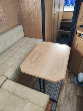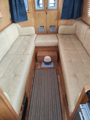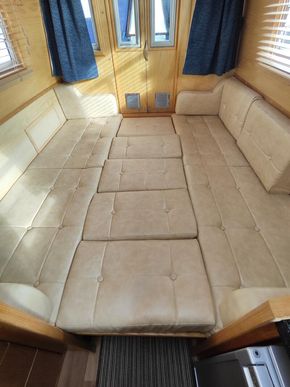 Comfortable saloon with seating that easily converts into a double bed using a pull-out platform stored under the bow – a more convenient solution than the typical tabletop conversion