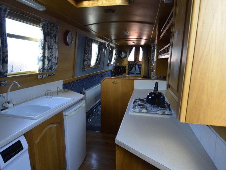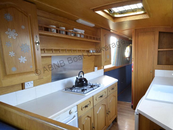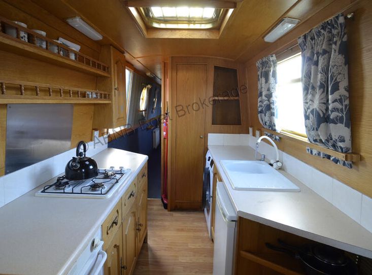 The galley is equipped with a gas oven and grill, separate hob, under-counter fridge with freezer compartment, and a washing machine, making her well suited for liveaboard use.