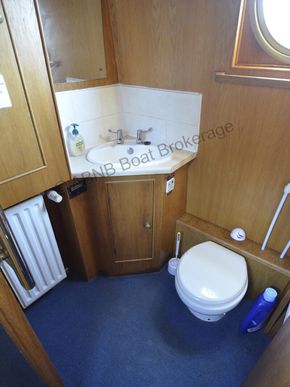 The bathroom houses a bath with shower over, washbasin and pump-out toilet. 230V power comes from a choice of three sources: an Electrolux 3500W engine driven generator, a Sterling 1.6kW inverter/charger or the landline. Batteries are kept trickle charged by three 165W solar panels with an MPPT controller.