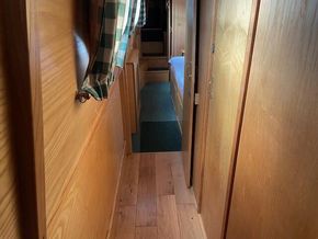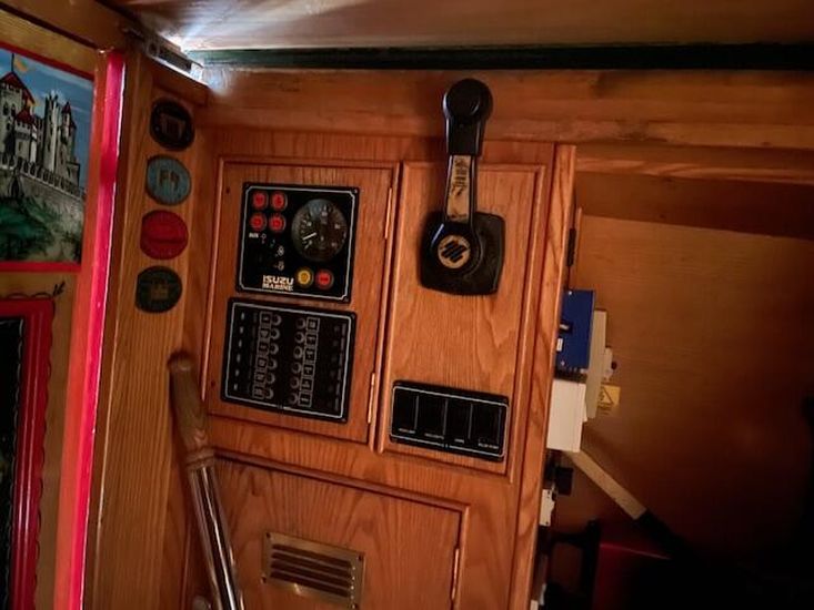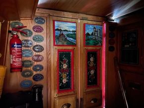 Treadmaster steps leading to stern. Instruments, rose and castle painted stern doors.