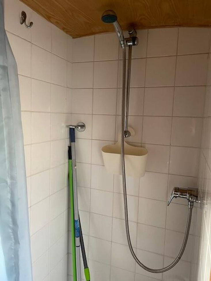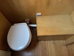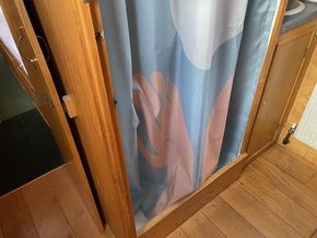 Bathroom: Tiled shower cubicle with curtain, vanity sink, dometic cassette toilet, mirrored cupboards, obscure porthole with roller blind, wooden floor.