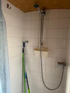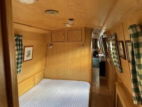 Bedroom: fixed double bed with above and below storage. Good sized wardrobe and drawers, radiator with cover, 3 portholes with curtains, carpet.