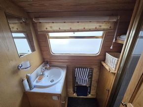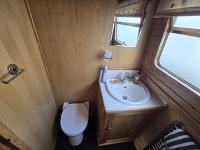 Bathroom: Large shower enclosure with shower and glazed door, vanity unit with inset wash basin, chrome mixer tap with cupboard below, Vetus pump-out toilet, full height storage beside shower, heated towel rail.