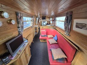Saloon: ‘L’ shaped fixed sofa/dinette which converts to double berth, drop leaf dining table, TV, corner cabinet windows and curtains.